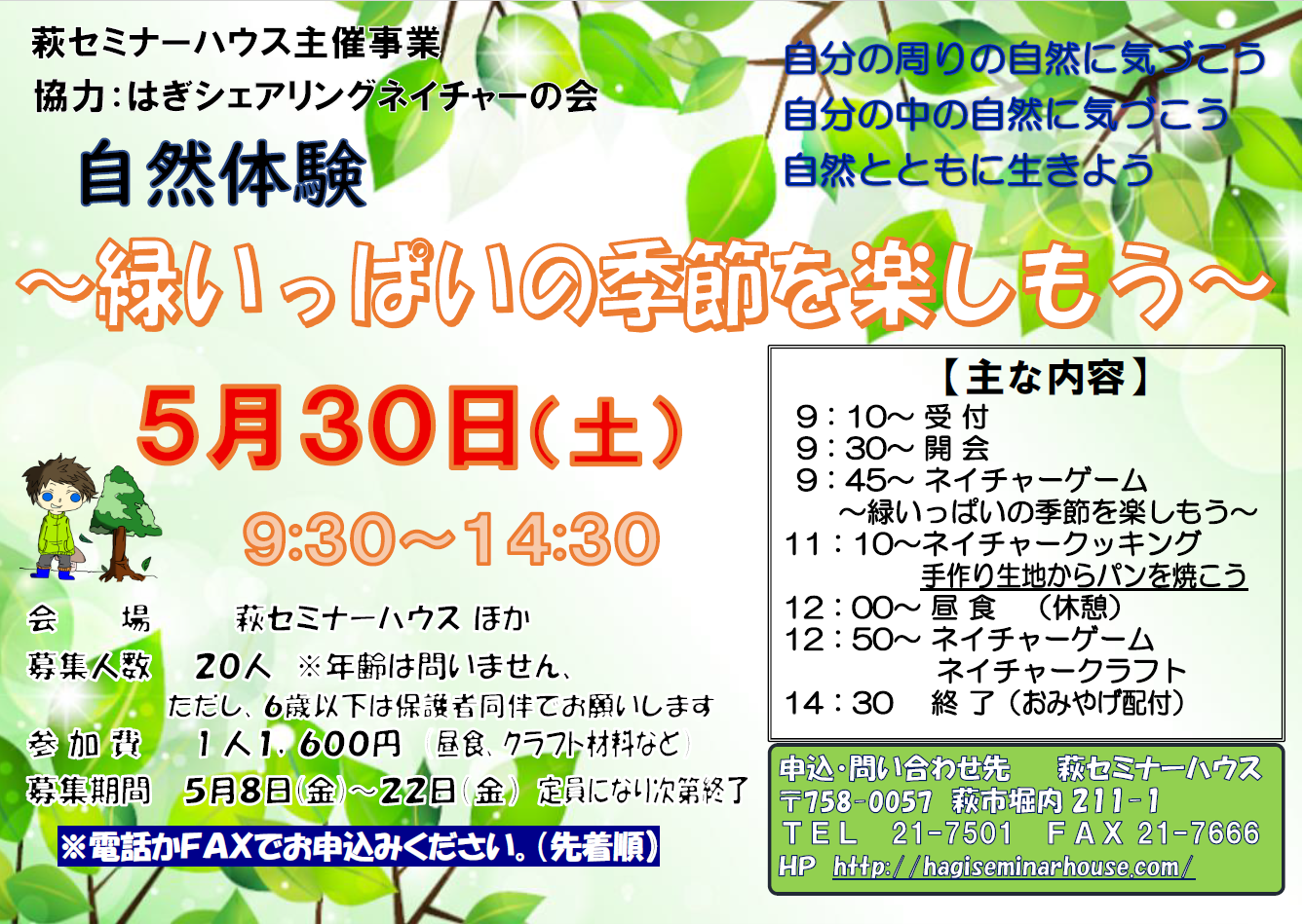 萩セミナーハウスでは、5月30日(土)に「自然体験~緑いっぱいの季節を楽しもう~」を開催します。